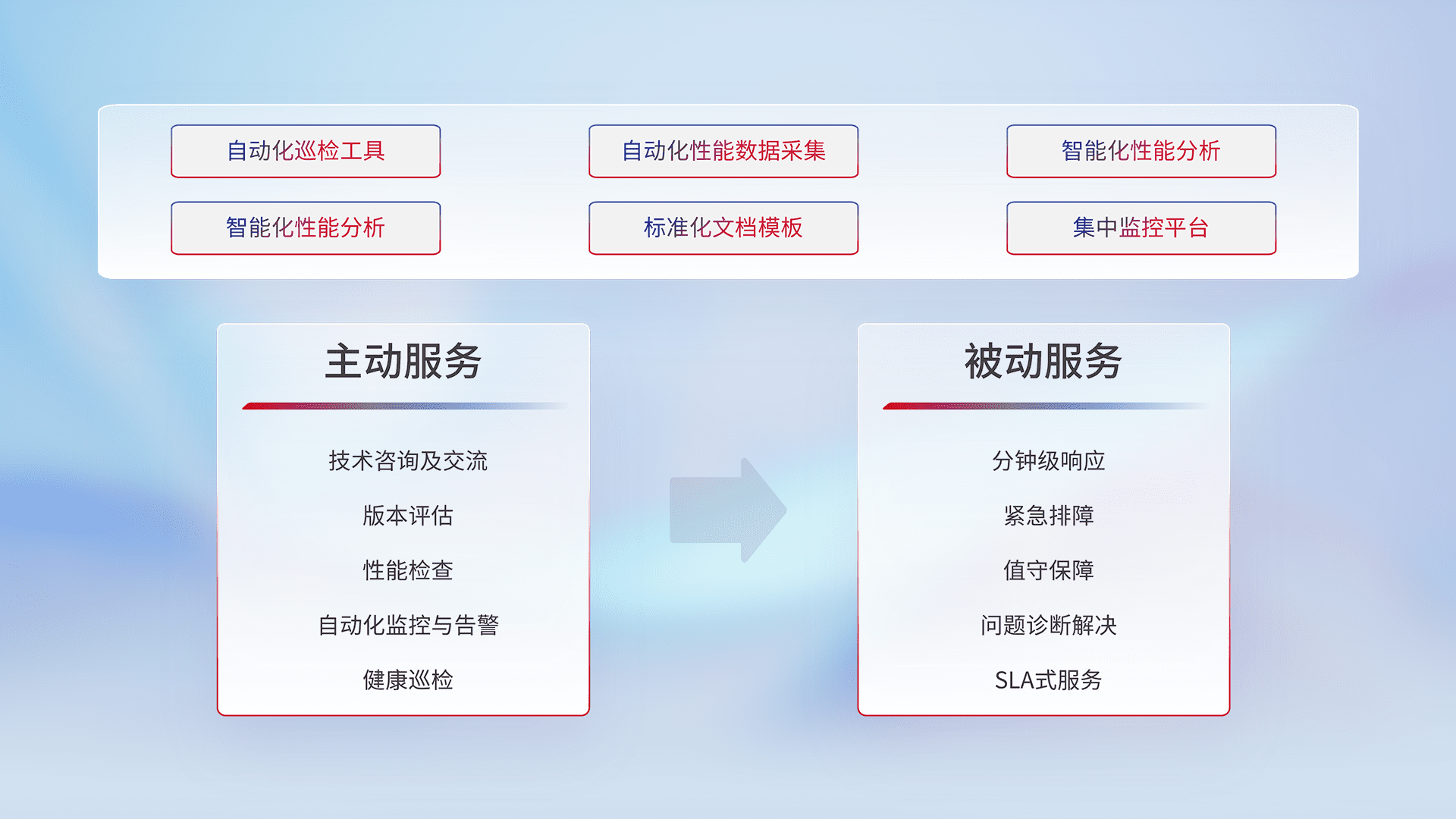 智能化工具和标准化文档,,,,保障服务质量,,,提供主动服务(包含技术咨询、、、版本评估、、、性能检查、、、、自动化监控与告警、、健康巡检)和被动服务包含(分钟级响应、、、紧急排障、、值守保障、、、问题诊断解决、、、、SLA服务)。。